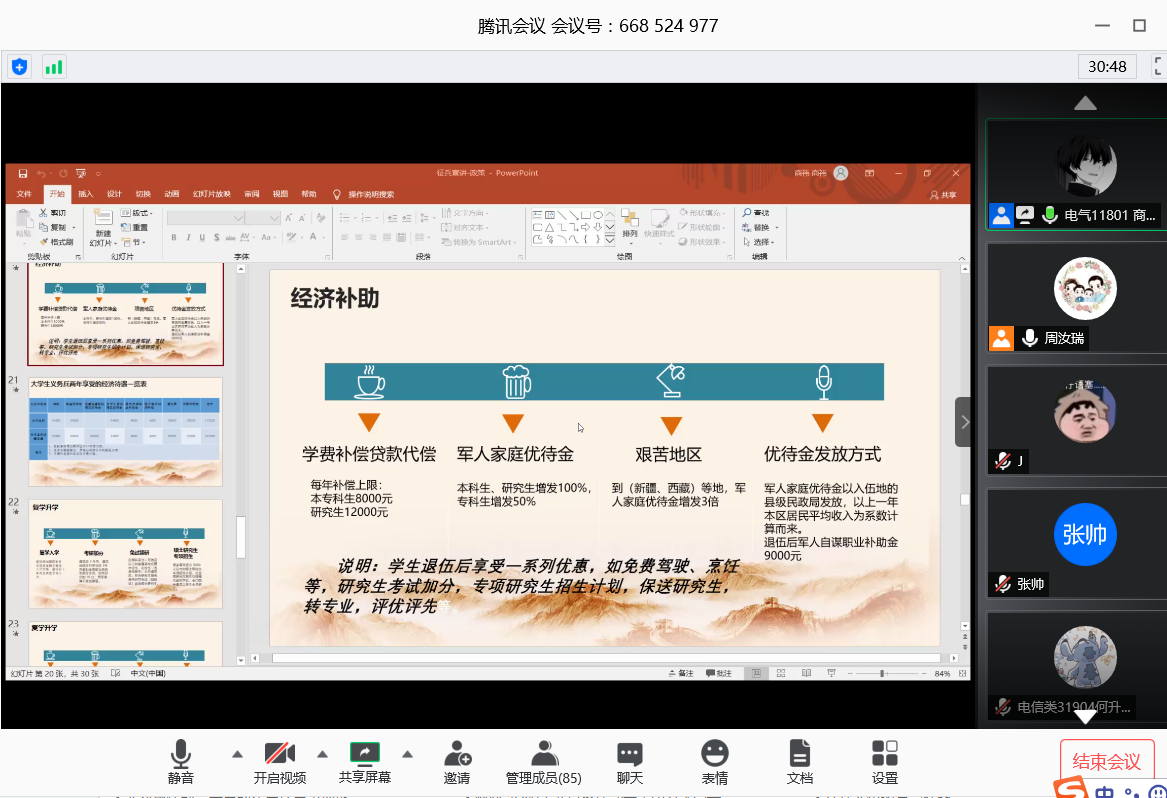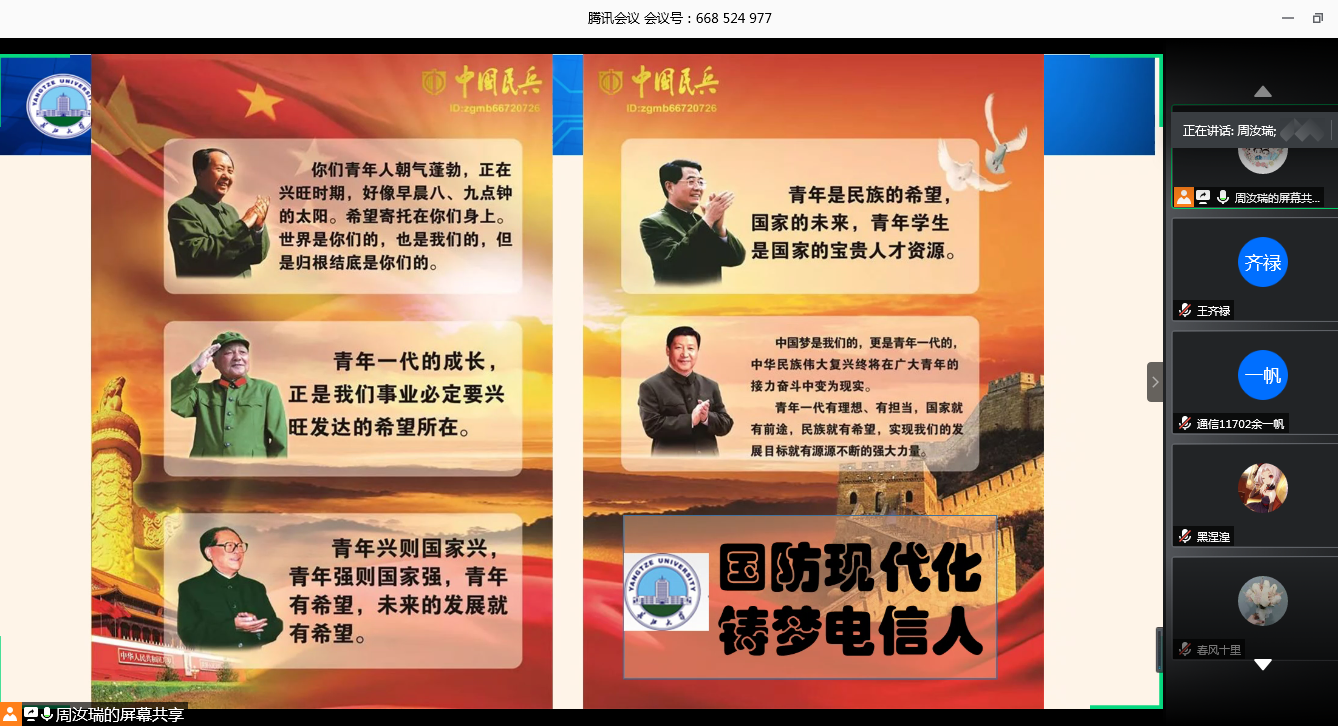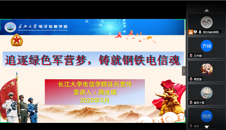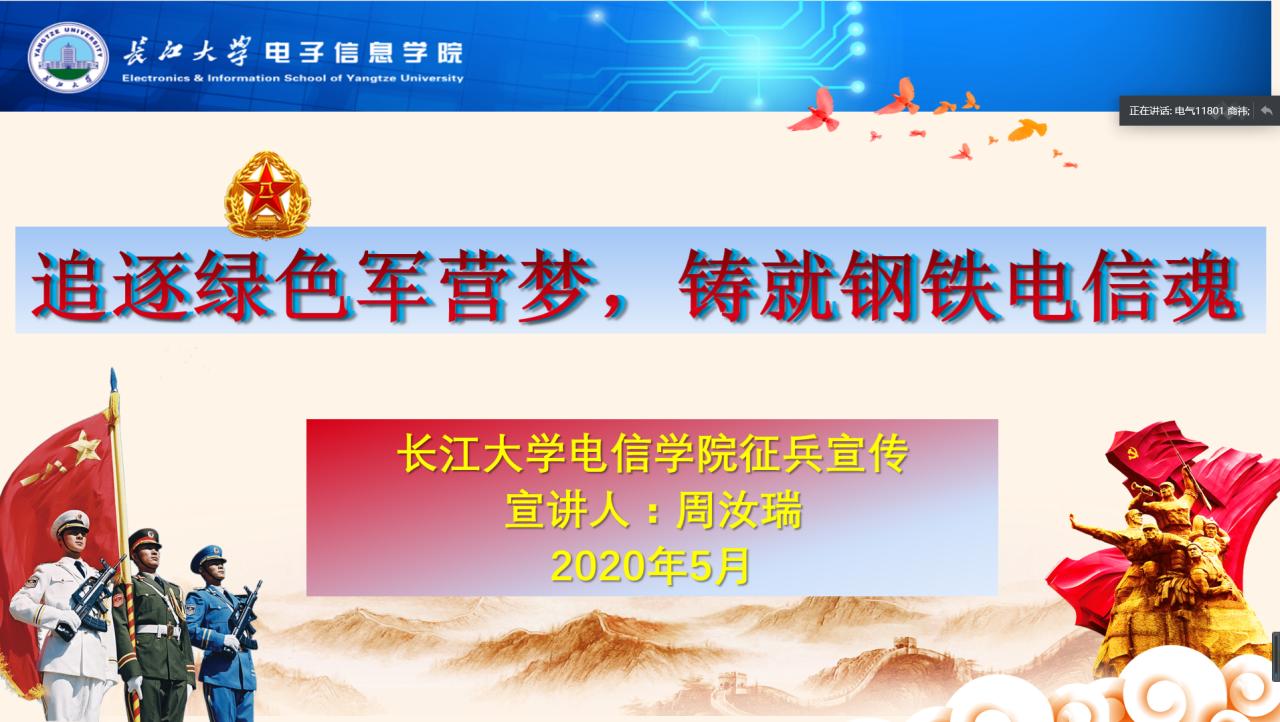 学生实际情况,周老师重点阐述了在校大学生参军入伍后在复学、考研、就业、公务员招考、士兵提干、学费及经济补偿等方面的优抚政策,以及电信人参军的十大好处,电信学生参军不仅仅是报效祖国,促进个人发展,更是充分结合自己的专业特长,在信息战、无人战中检验自己的专业技能,用自己的实际行动践行“训练强军、科技兴军”人生理想。