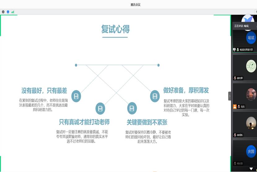 考研经验线上分享交流会于7月18日晚上19:00在腾讯会议举行。本次交流会邀请各年级对考研有兴趣意向的同学参加。交流会由2016级优秀考研学生刘杰主持。此次交流会参与本次经验分享的成员有喻斌(中国海洋大学)、褚雯琪(华中师范大学)、吴立鹏(西安电子科技大学)、查倩(哈尔滨工程大学)、唐俊辉(华中科技大学)。