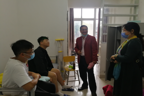 新生电气类32006班的周密同学在开学前期打篮球不慎摔伤了腿后,院领导特意前往该寝室探望周密同学,进行慰问和鼓励,并专门为他安排了一间残障备用寝室。