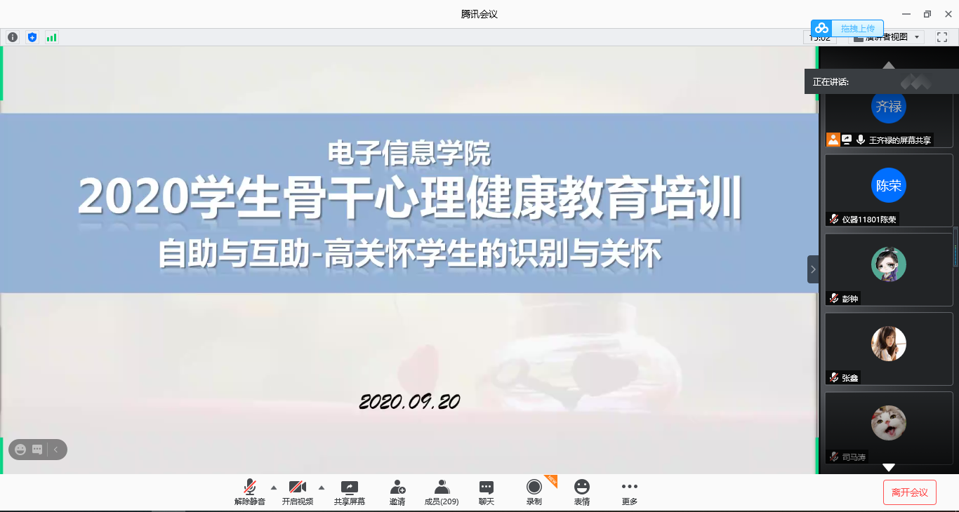 存在心理、是否需要上报老师等。培训的最后,为大家介绍了学校的心理健康教育中心,推荐大家在遇到问题、心