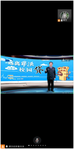 同学统一以班级组织网络会议的形式进行全院线上同期直播观看,真正做到了全员参与,共同学习,同上一堂课。会议内容分为两大部分,分别为一分钟的“套路贷”剪纸艺术短片,艺术短片的制作无不使原本难以接收的“套路贷”知识,以一种生动形象的动画形式展现出来;第二部分 是35分钟的“远离非法校园贷”讲座,专题授课直击要点,使同学们有如拨云见雾,醍醐灌顶。