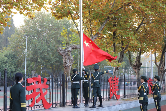 在洪亮的指令声下,国旗护卫队迈着整齐划一、铿锵有力的步伐将鲜红的国旗护送至升旗台,带领全体同学进行庄严的升旗仪式。伴随着神圣的中华人民共和国国歌,五星红旗冉冉升起,全场师生满怀着对祖国无尽的热爱,向国旗行注目礼。国旗迎风飘扬,何其有幸山河无恙,吾辈更应自强。