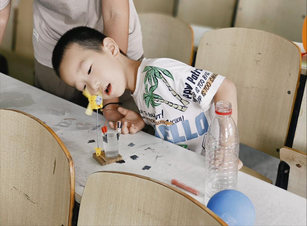 学生的课程设计作品,帮助他们了解科技文化知识,并激发他们对科学技术的兴趣。除了理论知识外,团队开展了科技小课堂活动——“盐水发电”、“柠檬电池”、“动力气流”等诸多模块,并配有专门的志愿者进行演示,向他们讲解其中的实验原理,然后在志愿者的监护下,让小朋友也可以尝试这样的小实验。让孩子们亲自参与一些简单的应用实验,从而增强孩子们的动手能力,将所学知识与实际应用联系起来。