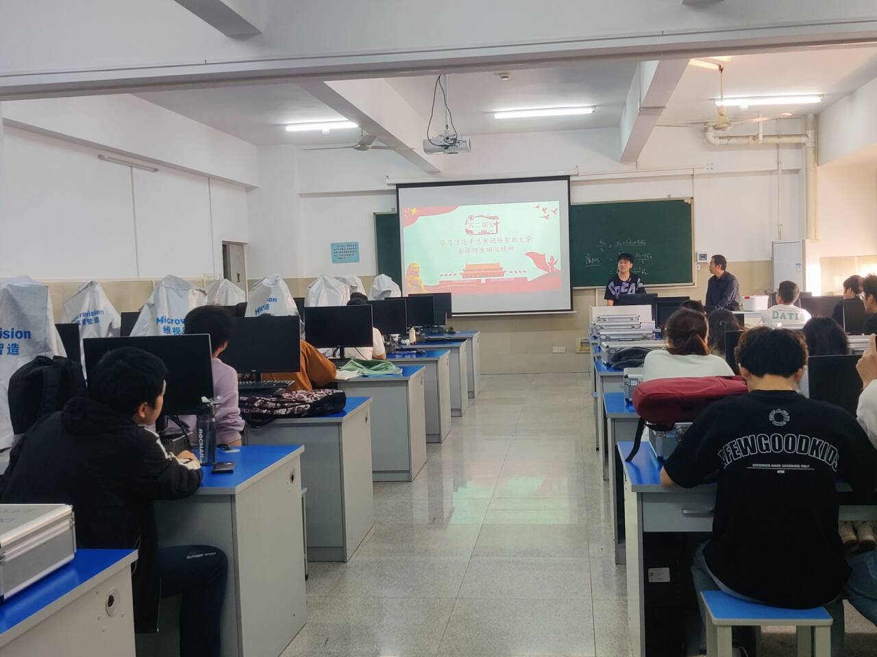 自产12101团支部于10月21日上午在主教1204教室举行班团会。首先是邓豪杰同学带领班级同学集中学习学习习近平总书记在庆祝中华人民共和国成立75周年招待会上的讲话精神,增进对中华民族和伟大祖国的情感,传承民族精神、增强国家观念。通过这次学习活动,引导全体青年团员努力学习,珍惜青春,学好专业知识,以实际行动回应国家的培养,为建设新时代贡献出自己的一份力量。