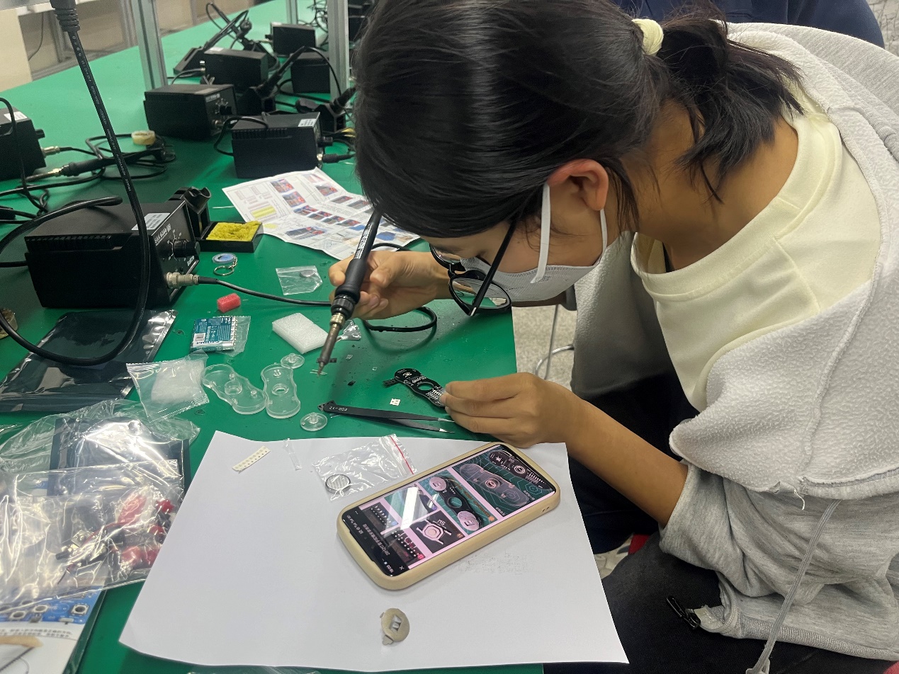 的专业特色。在老师的指导下,同学们亲手制作“指尖陀螺”和“像素游戏机”等兼具趣味性与科技感的电子作品。通过焊接电路、组装元件,同学们不仅锻炼了专业技能,更在专注的动手实践中释放了压力,体验到了创造的乐趣和成就感。