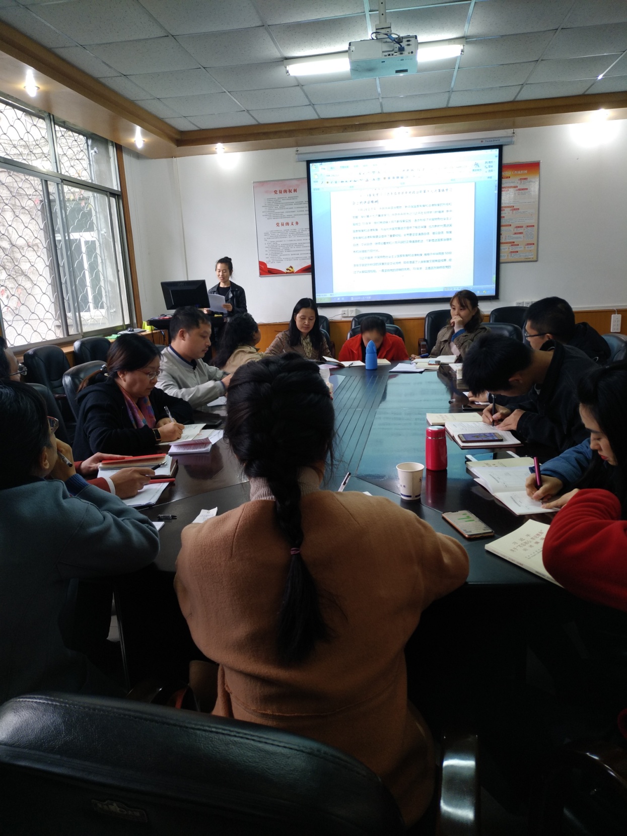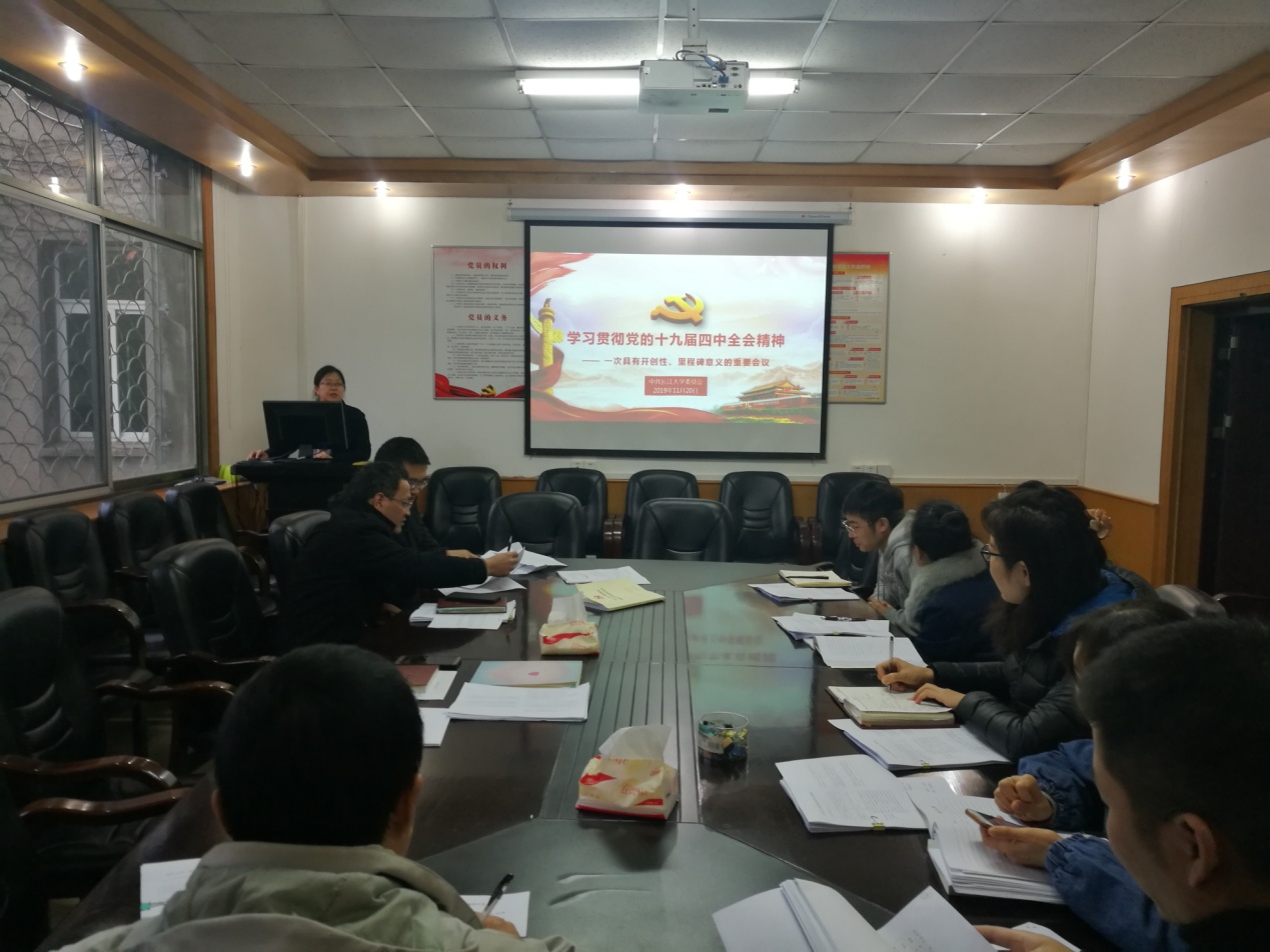20191125日下午大福娱乐城apk 分党委分别召开理论学习中心组学习和党支部书记会议,由分党委书记宣讲四中全会精神。会后各党支部组织开展11月份第二次支部主题党日活动,集中学习贯彻党的十九届四中全会精神。28日分党委书记刘逸组织全体教职工和学生党员、发展对象学习贯彻党的十九届四中全会精神。在学习贯彻党的十九届四中全会精神会上,通过“一图读懂四中全会”熟悉了党的十九届四中全会的会议内容、我国国家制度和国家治理体系具有的显著优势、坚持和完善中国特色社会主义制度推进国家治理体系和治理能力现代化的总体目标和工作要求;通过观看微视频“字里行间看《决定》”,对《决定》中的3大板块、15个部分、200多项重大举措、222个高频关键词“制度”有了更全面的了解;通过学习“上善若水,水滴石穿——学习贯彻党的十九届四中全会精神等内容”,对党的十九届四中全会精神有了更深入的理解和体会。刘书记结合宣讲党的十九届四中全会精神,讲了一次形势与政策课,上了一堂生动的主题教育党课。