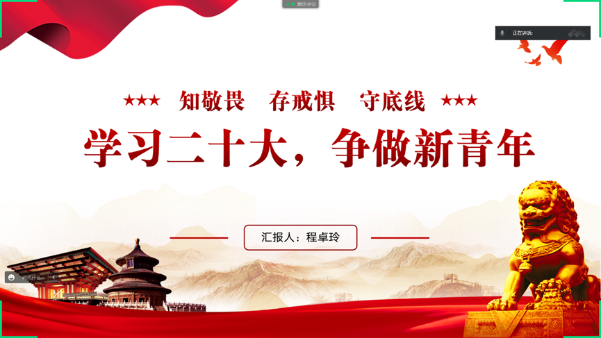 12月21日,信卓12001团支部在腾讯会议举行班团会。会上,同学们深入开展了学习习近平总书记在中国共产党第二十次全国代表大会上所作的报告和发表的重要讲话精神,让广大青年学子清楚认识到当今幸福生活来之不易,要继续努力学习,回报党和国家;同时也开展学习贯彻党的二十大精神宣讲工作,充分用好网络新媒体,加强二次传播,营造浓厚氛围。