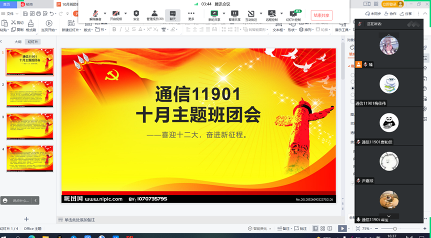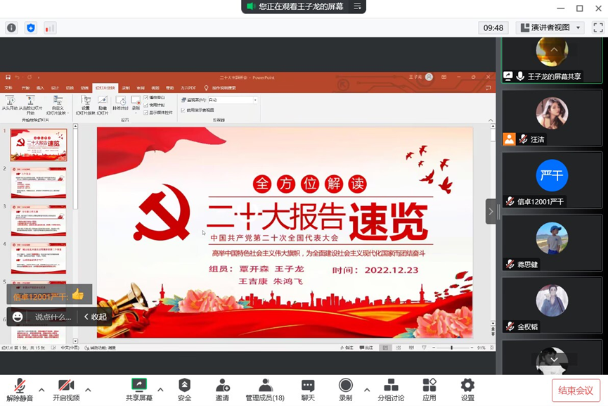 12月16日,人工智能12101团支部线上举行班团会。本次活动以“学习二十大,争做新青年”为主题,同学们认真学习了习近平总书记在中国共产党第二十次全国代表大会上所作的报告和发表的重要讲话精神。通过这次学习活动,引导全体青年大学生更加深刻的领悟党的二十大精神,为实现第二个百年奋斗目标奉献自己的力量。
