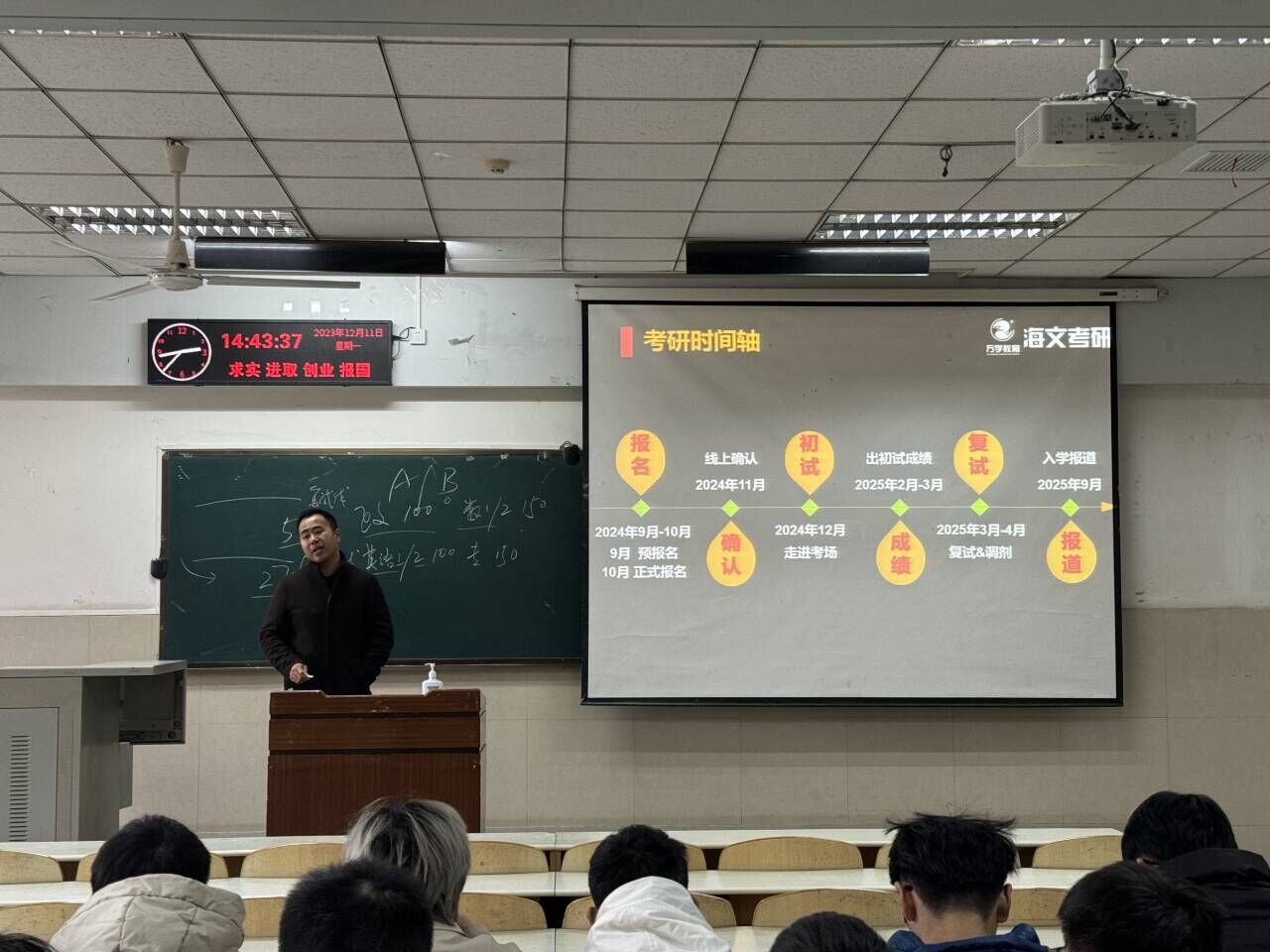杨剑锋老师分析了近几年考研的宏观形势,鼓励大家既要看清挑战,又要看到希望,要明确目标,树立起一往无前的勇气;他通过“三次选择、三次调配”重点向大家介绍了考研择校的方法,表示考研择校要综合考虑专业、城市、院校、能力等因素,要提高信息获取能力,缩小信息差,他的讲解让摇摆不定的同学有了更坚定的想法;最后他还介绍了基础阶段的复习方案,给同学们列出了复习公共课的计划表和时间安排。
