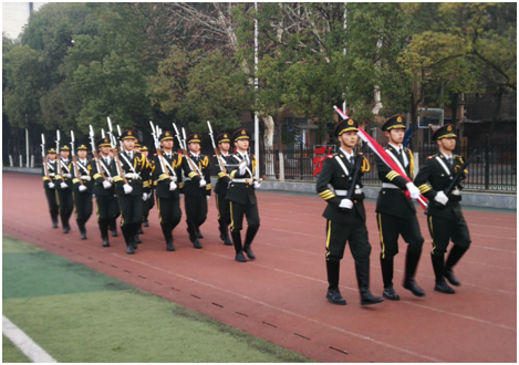 7:00,升旗仪式活动第一项,主持人宣布国旗升旗仪式正式开始。长江大学国旗护卫队旗手们手握着国旗、穿着统一的军装,迈着整齐的步伐朝升旗台走来。随着升旗手振臂一挥,鲜艳的五星红旗伴随着高昂的中华人民共和国国歌冉冉升起,全院师生行注目礼。