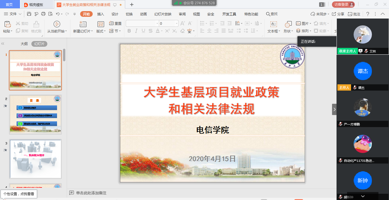 利用腾讯会议开展4月份就业指导活动,通过政策宣讲和解读,促使毕业生熟悉国家就业政策和学校就业管理规定。近300名学生参加会议,活动由就业专干艾林老师主持。