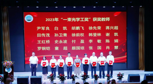 谢凯老师荣获“优秀研究生导师”,颜国琼老师荣获“优秀辅导员”。9月10日,学校隆重举行第39个教师节庆祝大会,校友李树光为2023年“一束光学工奖”获奖教师颁奖。
