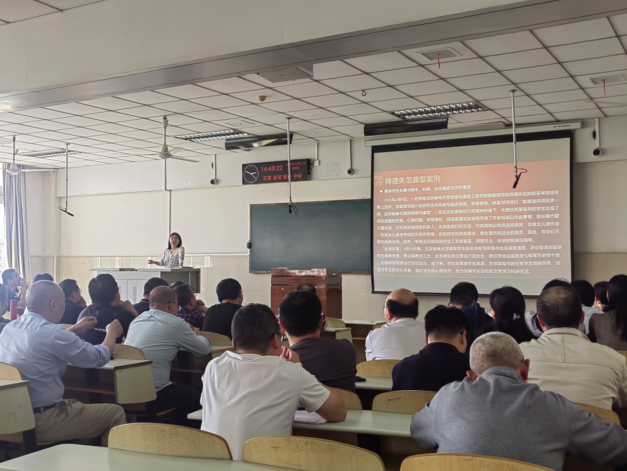 郭梅向全体教师传达了人力资源部关于师德师风建设月活动的相关通知精神,带领全体教师集中学习了全国教育大会精神,围绕近年来高等教育系统内发生的师德失范典型案例进行深入剖析。案例涵盖学术不端、违反公序良俗、违反教学纪律等多个方面,通过详细阐述事件经过、处理结果以及造成的恶劣影响,让全体教师深刻认识到师德失范行为的严重后果。每一个案例都如同警钟,发人深省,让教师们深刻意识到,在教育教学工作中,必须时刻保持清醒头脑,坚守职业道德底线。